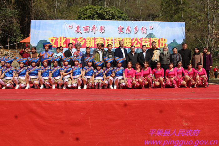 为深入推进“美丽广西”乡村建设,巩固提升清洁乡村、生态乡村建设成效,把乡村建设与脱贫攻坚紧密结合起来,打造好“美丽百色”乡村建设升级版,努力实现农业强、农民富、农村美的生态文明目标,1月22日,平果县在坡造镇伏琴村昌一屯举行“美丽平果·宜居乡村”工作现场会。百色市质监局局长韦晓新、平果县委副书记张银岳、副县长蓝云峰、副县长吴洪流、各乡镇党政主要领导等共同参加现场会,并观看了“美丽平果·宜居乡村”文化下乡新春送温暖公益演出活动。